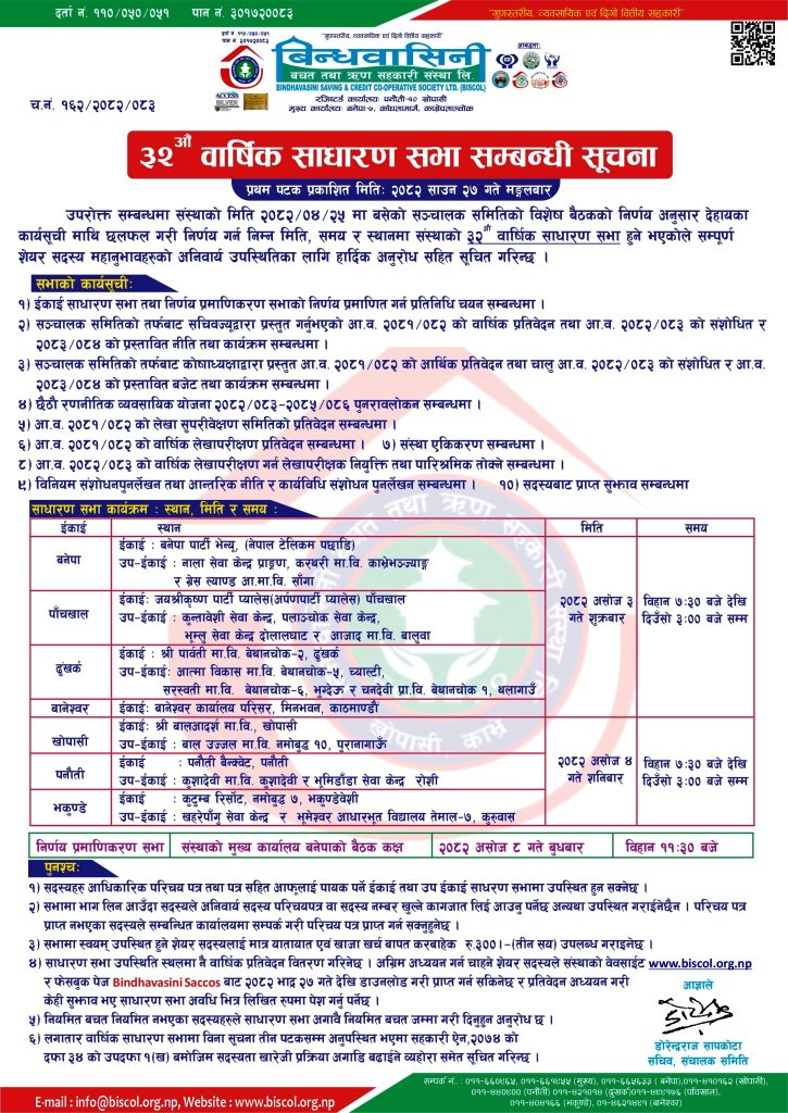 बिन्धवासिनी बचत तथा ऋण सहकारी संस्था लि.को वार्षिक साधारण सभा सम्बन्धी सूचना