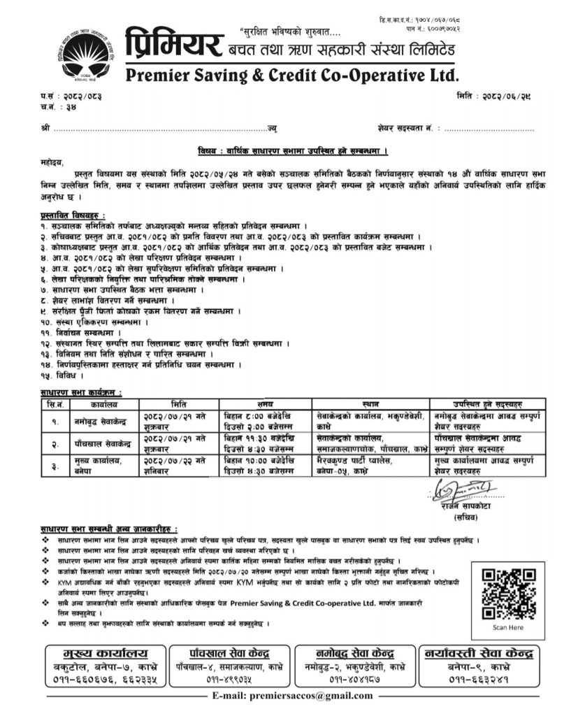 प्रिमियर बचत तथा ऋण सहकारी संस्था लिमिटेडको वार्षिक साधारणसभा सम्बन्धि सूचना बिज्ञापन प्रतिक्रिया दिनुहोस !