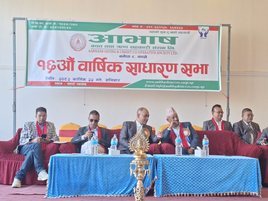 बनेपा । आभाष बचत तथा ऋण सहकारी संस्था लिमिटेडको १६औं वार्षिक साधारण सभा अध्यक्ष ग्रुवेन तौजेलको अध्यक्षतामा सम्पन्न भएको छ। कार्यक्रममा संस्थाका संस्थापक अध्यक्ष एवं प्रमुख सल्लाहकार तथा नेपाल उद्योग वाणिज्य महासंघका उपाध्यक्ष सुरकृष्ण बैद्य प्रमुख अतिथि रहे।