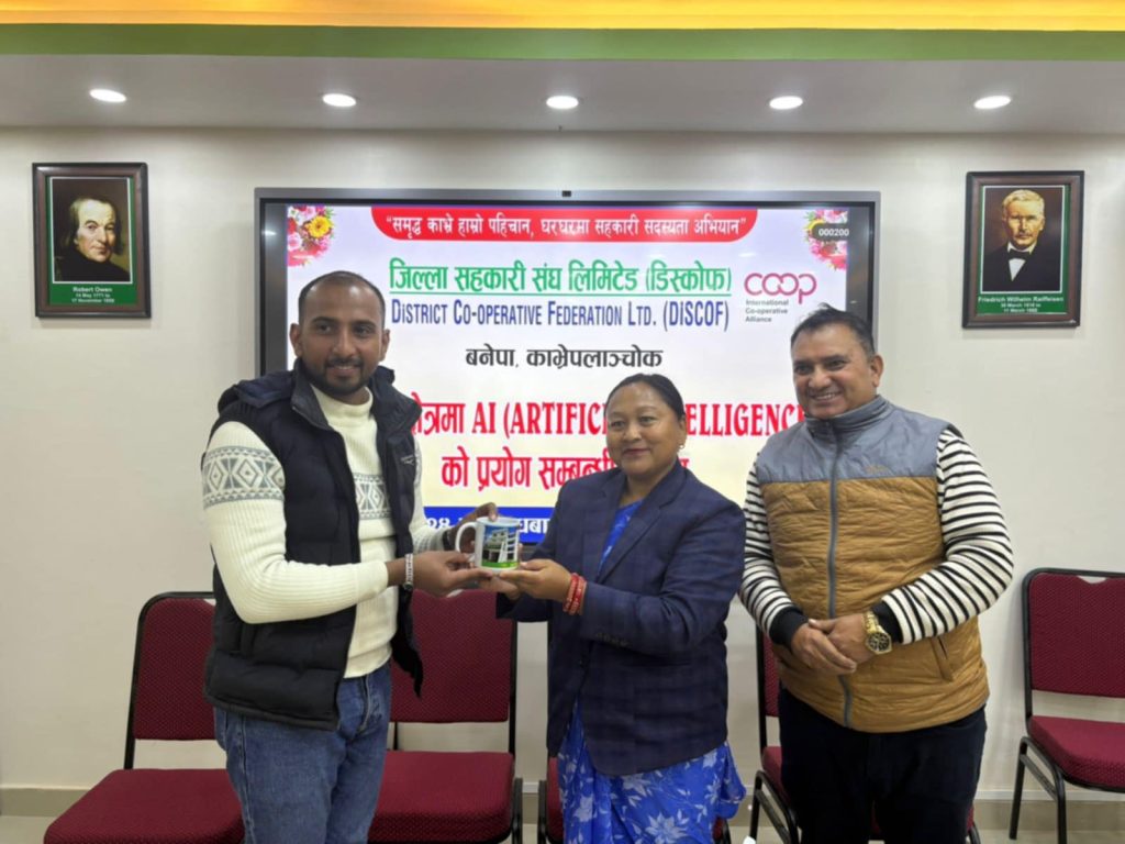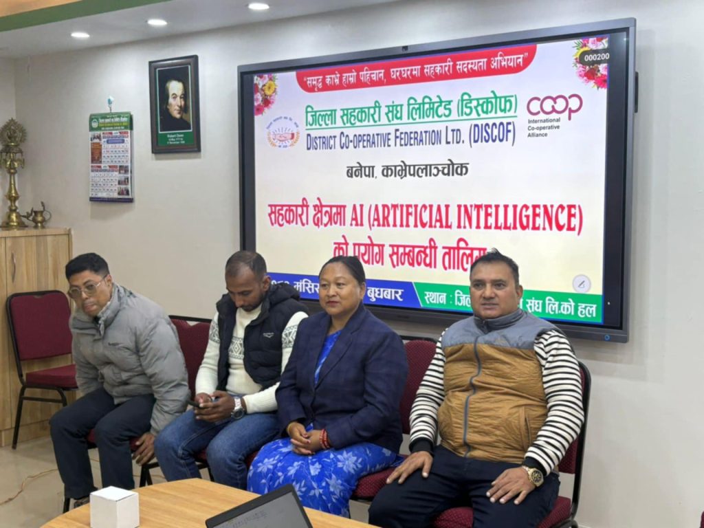 जिल्ला सहकारी संघ लिमिटेड (डिस्कोफ) काभ्रेको आयोजनामा मिति २०८२ मंसिर २४ गते “सहकारी क्षेत्रमा AI (Artificial Intelligence) को प्रयोग” विषयक एकदिवसीय तालिम संघको सभाहलमा सफलतापूर्वक सम्पन्न भएको छ। तालिम कार्यक्रम संघका शिक्षा तथा तालिम व्यवस्थापन उपसमिति संयोजक शान्ती लामा तामाङको सभापतित्वमा तथा संघका अध्यक्ष अमन पोटे श्रेष्ठको प्रमुख आतिथ्यतामा सम्पन्न भएको थियो। कार्यक्रममा प्रविधि विज्ञ सन्दिपराज भाटले सहजकर्ताको भूमिका निर्वाह गरेका थिए।