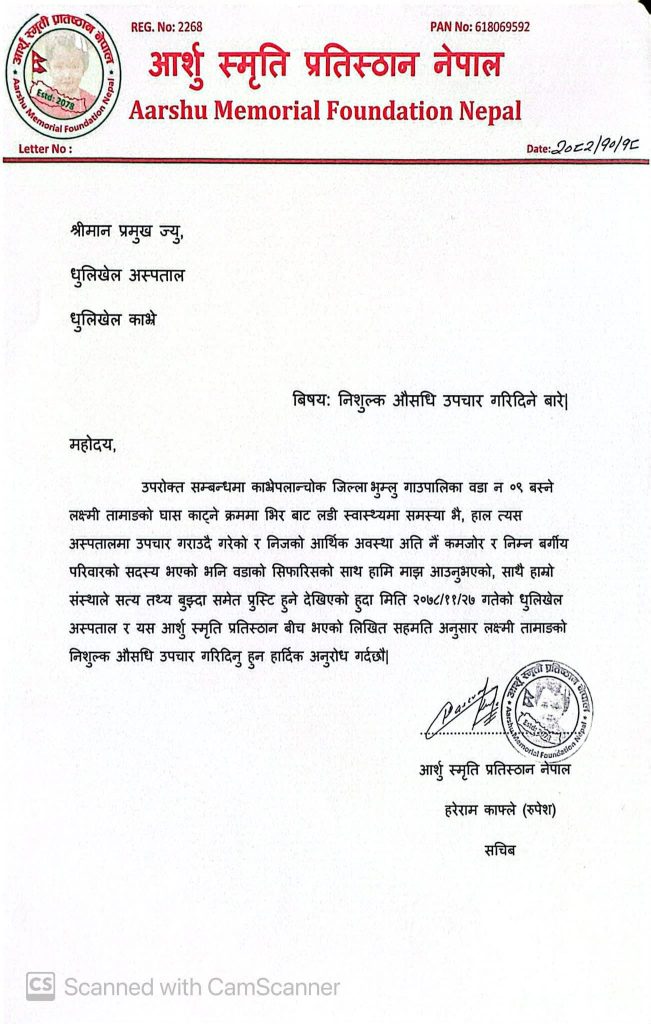 बनेपा- काभ्रेपलाञ्चोक जिल्लाको भुम्लु गाउँपालिका–९ निवासी लक्ष्मी तामाङको निःशुल्क उपचार आर्शु स्मृति प्रतिष्ठानले गरेको छ । घाँस काट्न जाने क्रममा भिरबाट लडेर गम्भीर घाइते हुनुभएकी तामाङको आर्थिक अवस्था अत्यन्त कमजोर रहेकाले प्रतिष्ठानले उपचारको जिम्मा लिएको हो।