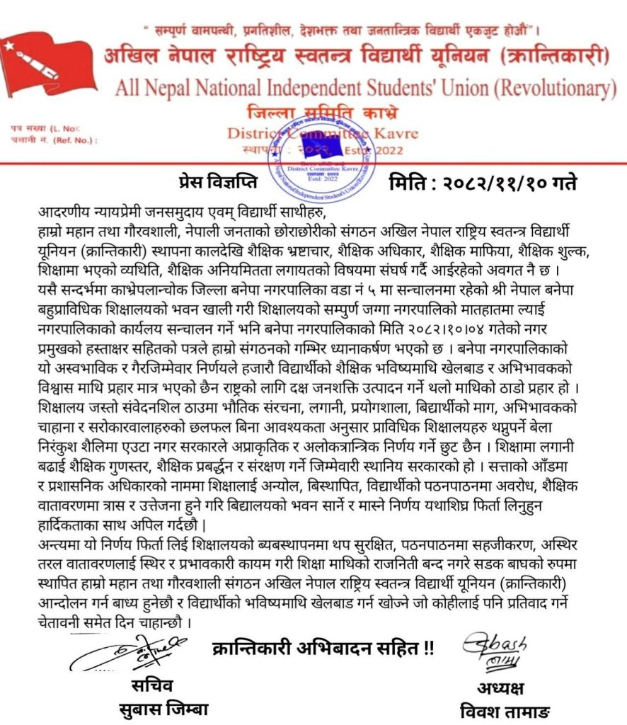 काभ्रे, बनेपा — अखिल नेपाल राष्ट्रिय स्वतन्त्र विद्यार्थी युनियन (क्रान्तिकारी) जिल्ला समिति काभ्रेले बनेपा नगरपालिकाले नेपाल बनेपा बहुप्राविधिक शिक्षालयको भवन खाली गरी सो स्थानमा नगर कार्यपालिका कार्यालय सञ्चालन गर्ने निर्णयप्रति गम्भीर आपत्ति जनाएको छ।