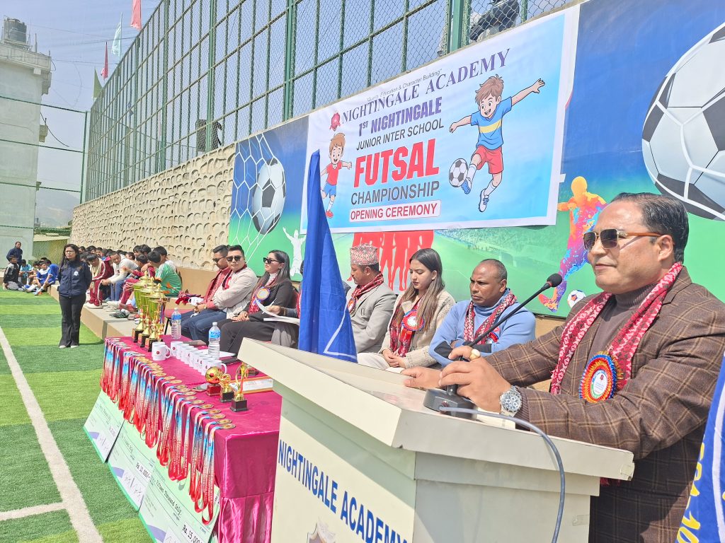 कार्यक्रममा विद्यालयकी प्रिन्सिपल उमा बस्नेतले स्वागत मन्तव्य राख्दै नाइटिङ्गेल एकेडेमीले शिक्षासँगै अतिरिक्त क्रियाकलापलाई सशक्त माध्यमका रूपमा अघि बढाएको उल्लेख गर्नुभयो। उहाँका अनुसार फुटसल जस्ता खेलले विद्यार्थीमा अनुशासन, आत्मविश्वास र सहकार्यको भावना विकास गर्न महत्वपूर्ण भूमिका खेल्छ।